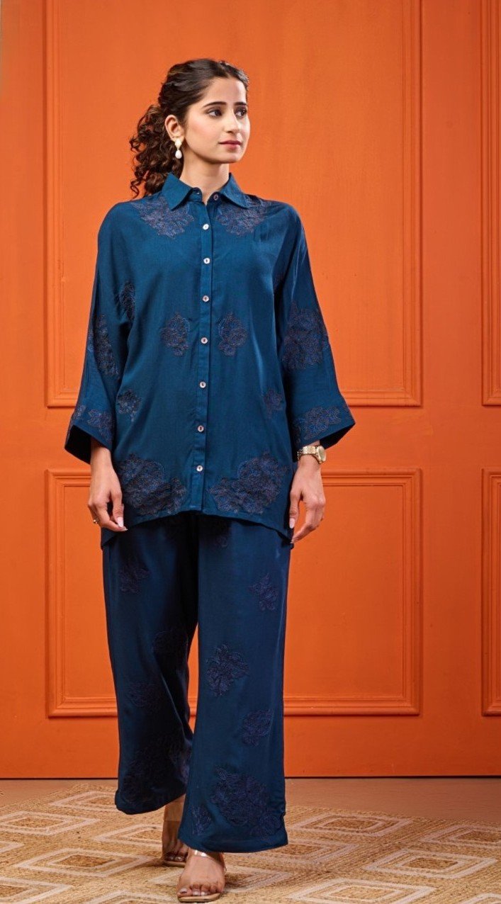 Dark Blue Vintage Luxe Embroidered Co-ord Set