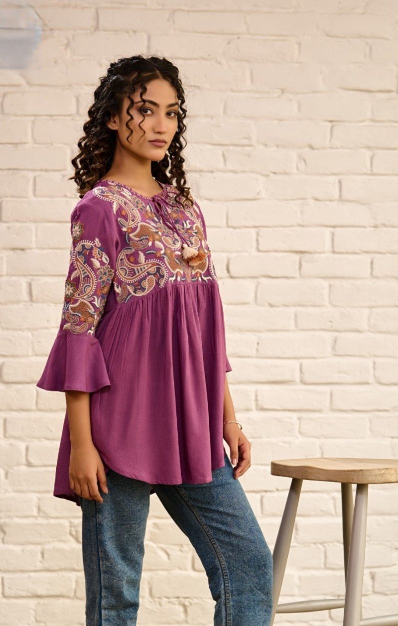 Upgrade your casual wardrobe with this beautifully embroidered flared top from Kalindi. Crafted for comfort and elegance, it’s the perfect blend of traditional charm and modern style.