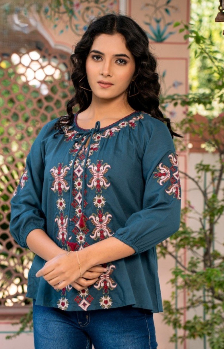 Pair this teal embroidered top with denim or straight-fit trousers for an effortlessly chic and comfortable Indo-western look.