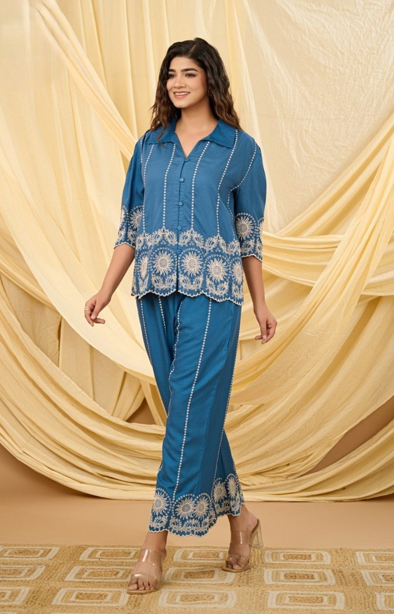 Embrace timeless elegance in this off-white embroidered co-ord set. Pair with nude heels and minimalist jewelry for a chic, effortless look — perfect for brunches, festive gatherings, or smart-casual occasions.